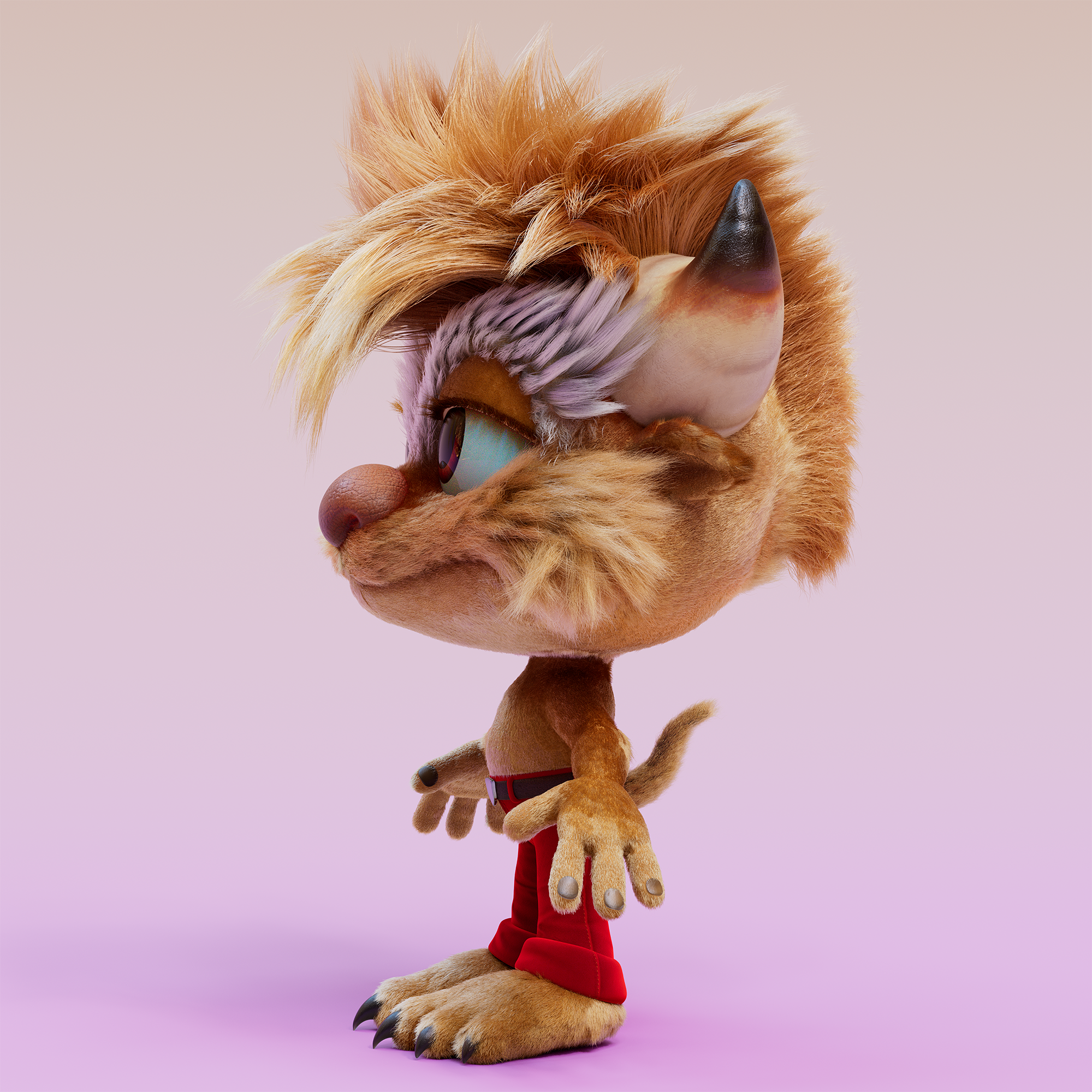 I learned so much through making this little guy - the hair in particular was a really fun and interesting challenge! The last image is one of the main references I used, drawn by my boss - I tried to keep the overall look of the main central character similar while also translating him successfully into 3D.